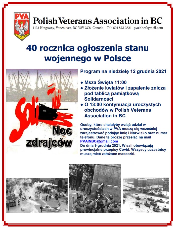 12 grudnia 2021 roku, podczas uroczystości rocznicowej w domu Polish Veterans Association in BC w Vancouver,2021.12.12. 40-ta rocznica stanu wojennego w Polscezostała zaprezentowana wystawa przygotowana dla upamiętnienia tej tragicznej daty w historii Polski.