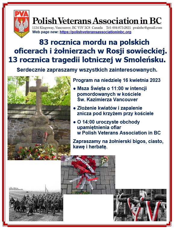 WRZESIEŃ 15: 85 Rocznica Wojny Obronnej z najeźdźcami – 1 września i 17 września 1939 roku. Msza Św. w Kościele w Vancouver i uroczystość w budynku naszej organizacji.
